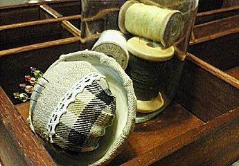 手持ちの布(以前キンカ堂で購入)とリネンで作った針山を