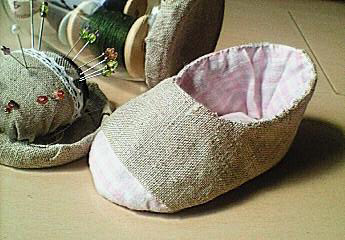 昔着ていたシャツの生地とリネンで作ってみたベビーシューズ。